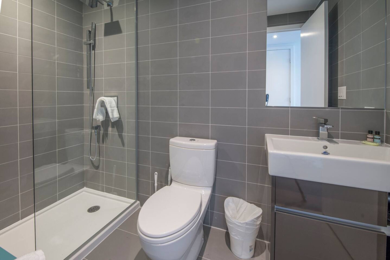 The bathroom is outfitted with a chic vanity and a soothing standalone shower, complemented by fresh towels, essential toiletries, and a hairdryer for your convenience.