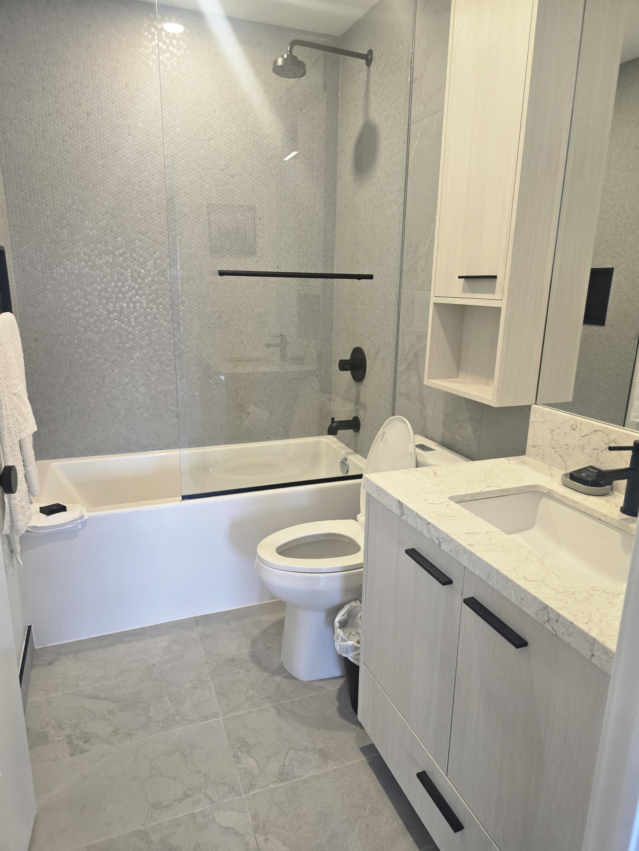This apartment offers a tranquil bedroom, featuring a queen-size bed and scenic neighborhood views for restful nights. A full bathroom with high-end fixtures provides the perfect setting to refresh and rejuvenate.