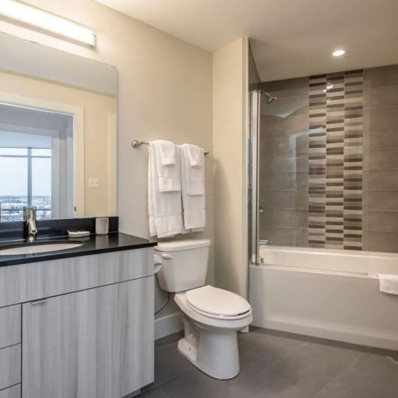 Retreat to the serene first bedroom, where you'll enjoy incredible skyline views. The attached modern bathroom features a sleek vanity, plush towels, and essential toiletries to ensure you start your day feeling refreshed and rejuvenated.