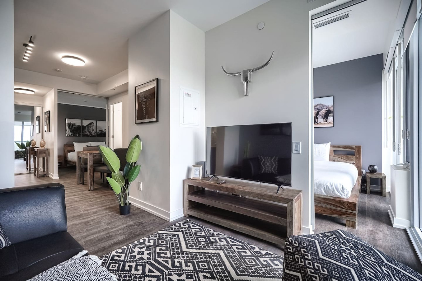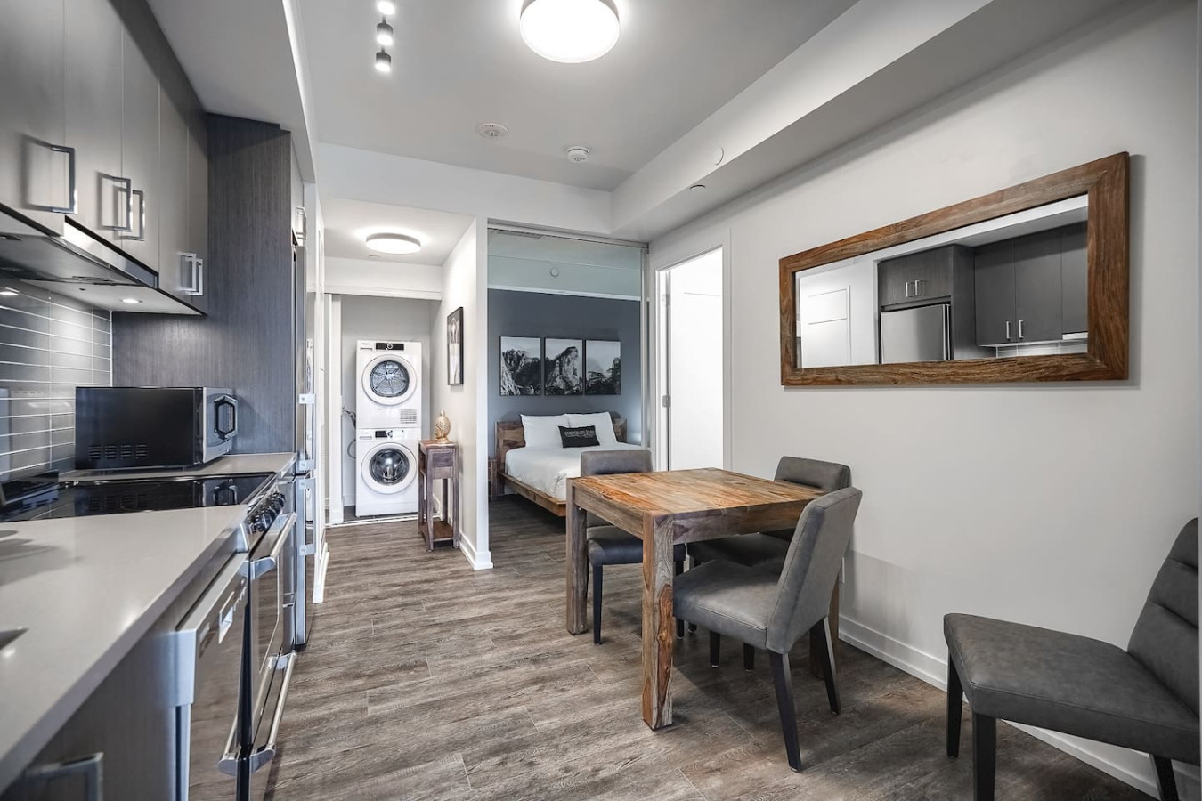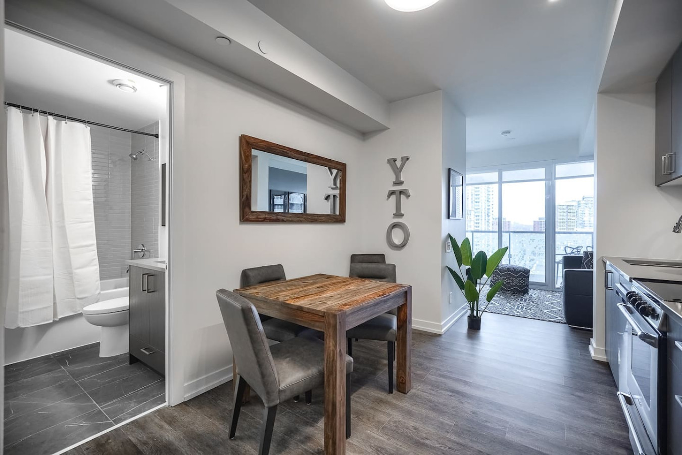 Step into a stylish sanctuary in the heart of Toronto. This open-concept space merges the kitchen and dining areas, all framed by sweeping skyline views. Unwind on the plush designer sofa, enjoy cinematic streaming on the premium Smart TV, or relax while admiring the cityscape from your private balcony. This space offers an elegant yet cozy retreat above the city’s vibrant pulse.