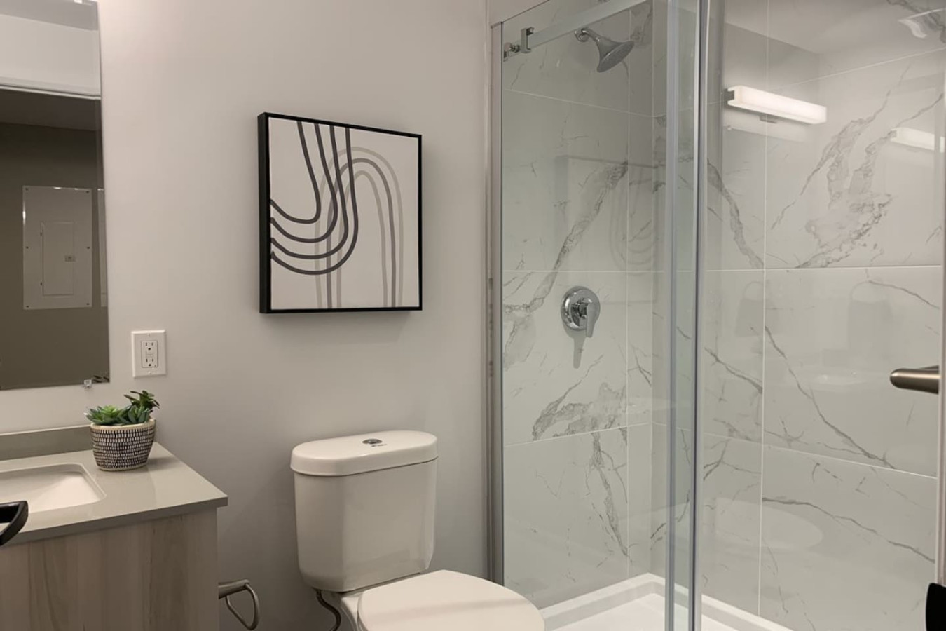 This apartment boasts a cozy bedroom designed for ultimate relaxation. Revel in the luxury of a Queen-size bed adorned with plush linens, creating a serene atmosphere for restful nights. A spacious closet provides ample storage, while the bathroom features a chic vanity, a glass-door standalone shower, fresh towels, and complimentary toiletries, offering a refreshing experience throughout your stay.