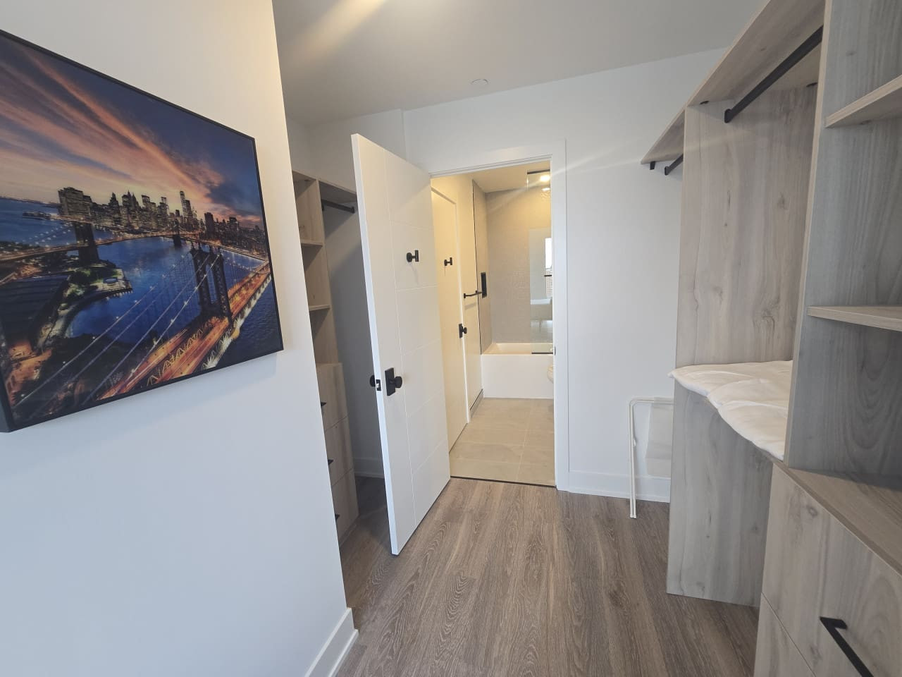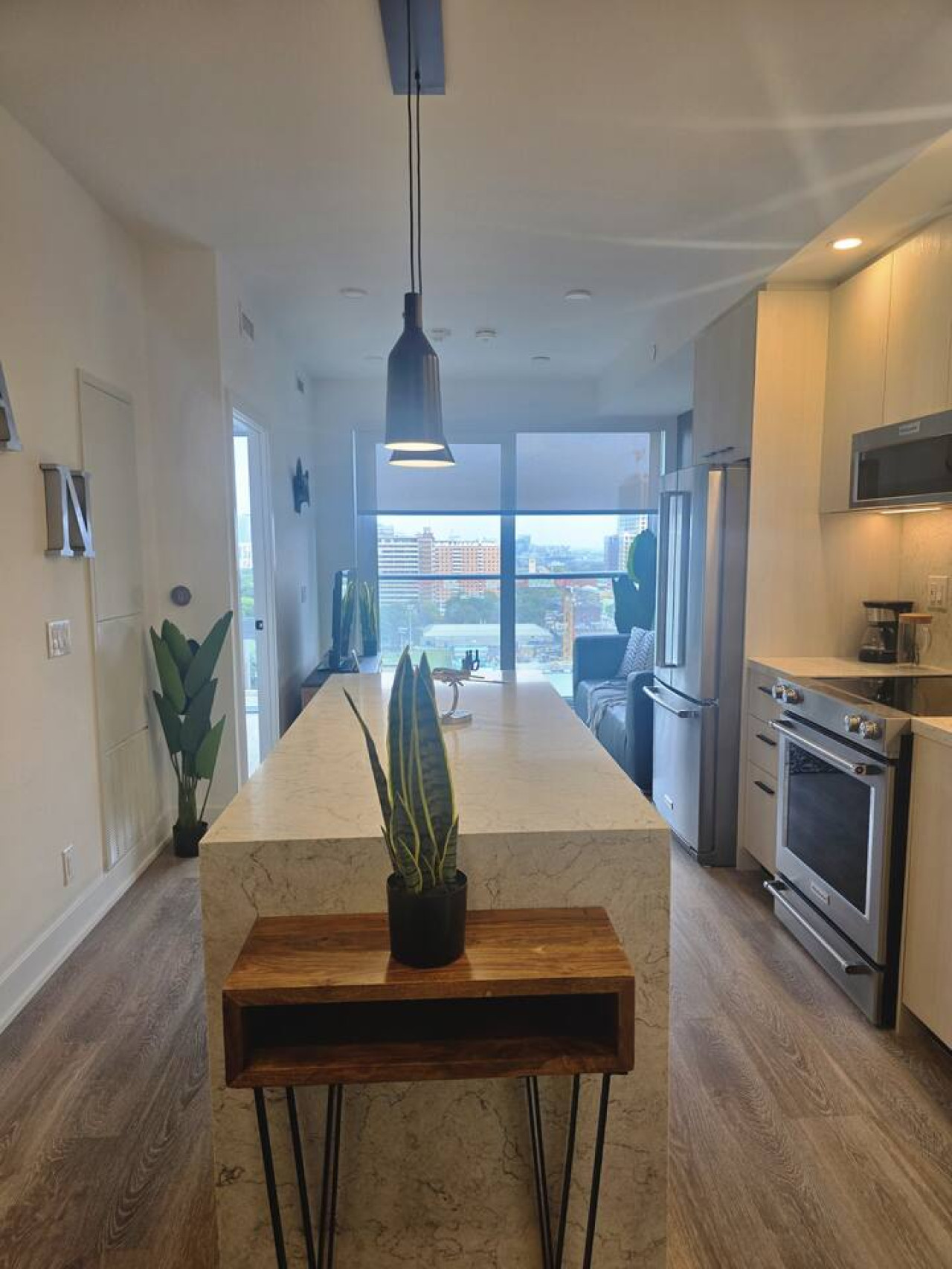 This apartment offers a tranquil bedroom, featuring a queen-size bed and scenic neighborhood views for restful nights. A full bathroom with high-end fixtures provides the perfect setting to refresh and rejuvenate.
